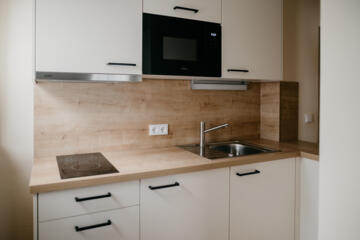 Unsere voll ausgestattete Küche bietet alles, was du für eine gelungene Mahlzeit benötigst. Mit Kaffeemaschine, Mikrowelle, Wasserkocher, Herd und Geschirr kannst du in der Ferienwohnung kochen und deine Lieblingsgerichte zubereiten.