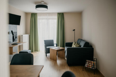 Entspanne dich auf dem gemütlichen Sofa (mit Bettfunktion). Das helle Wohnzimmer verfügt über einen Esstisch, Schreibtisch, einen modernen Flat-TV, WLAN und eine stilvolle Einrichtung, um deinen Aufenthalt zu einem komfortablen und angenehmen Erlebnis zu machen.